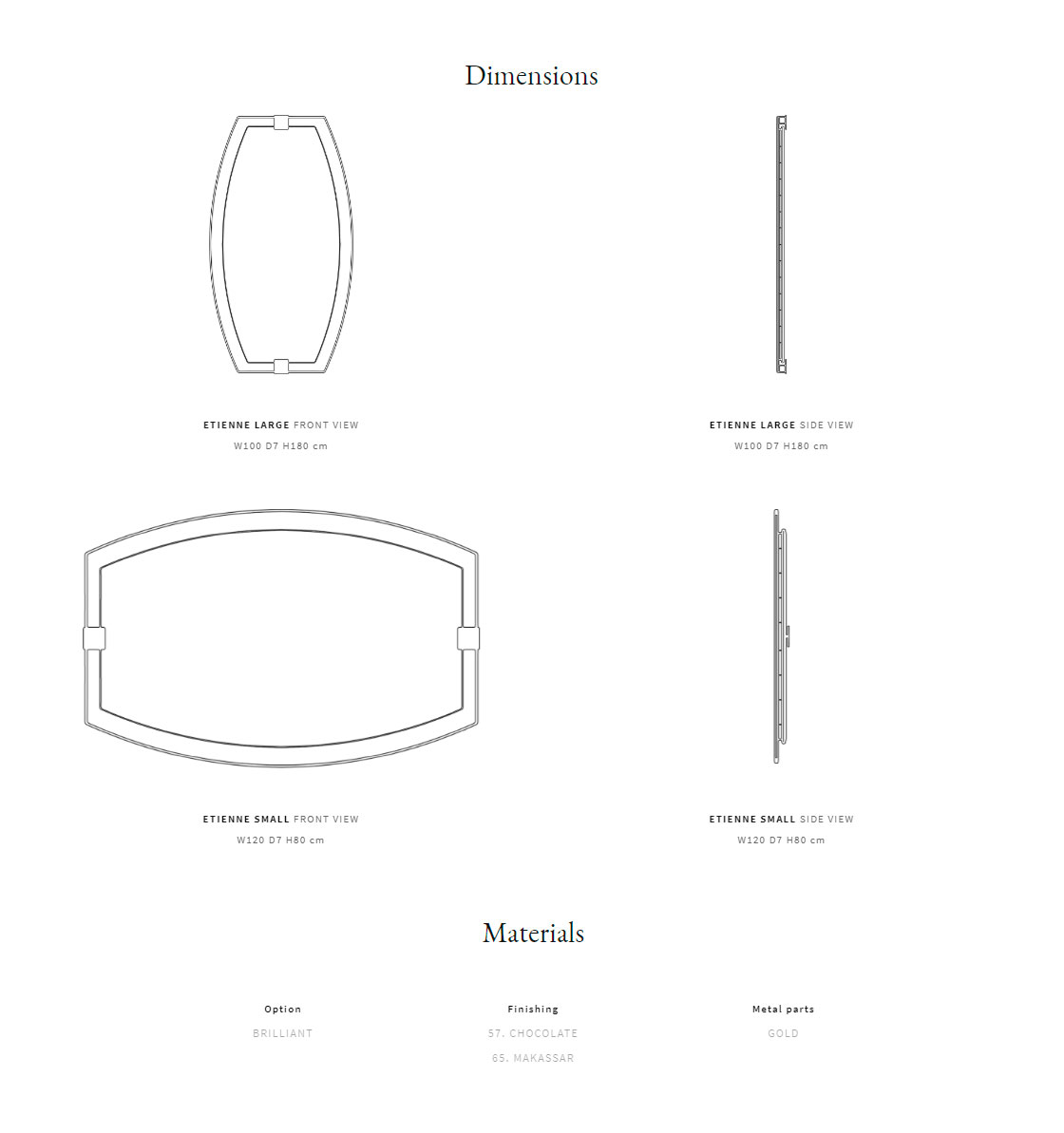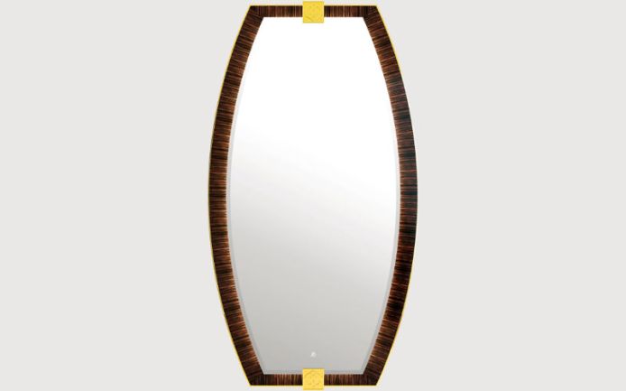 Plywood structure with metal profiles. Extra white mirror with brass supports. Available in lacquered wood, makassar ebony or palisander veneer; LED lighting included. Available sizes: large and small.