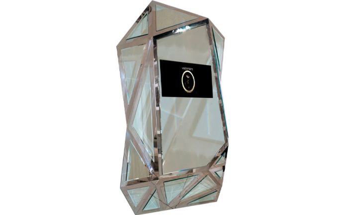 Multi-faceted mirror, with structure in polished stainless steel.