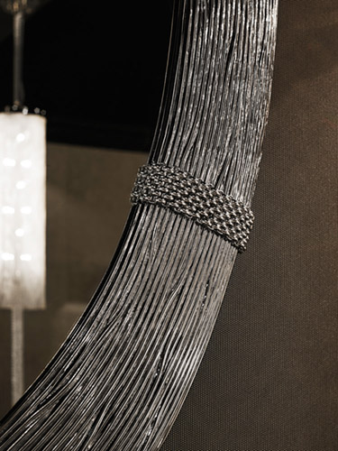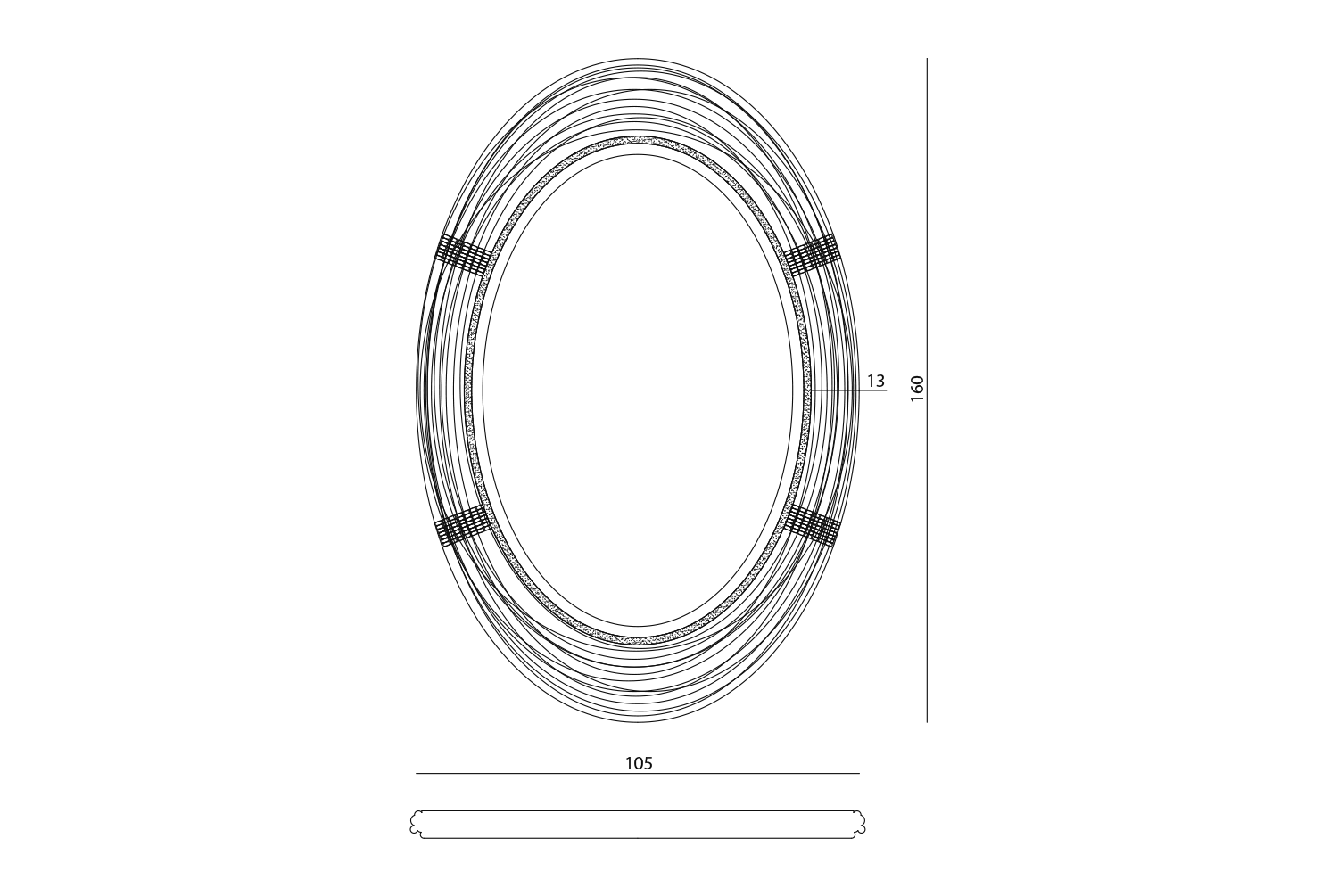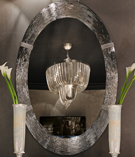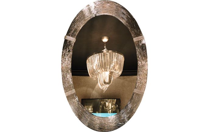Oval mirror structure in alloy casting, shiny chrome finishing or golden lacquered. Application of chromed chains in aluminium. Mirror th. 5 mm