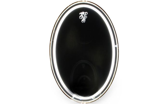 Gold lacquered finish frame, bevelled mirror with perimetral band and backlighted and sanded coat of arms.