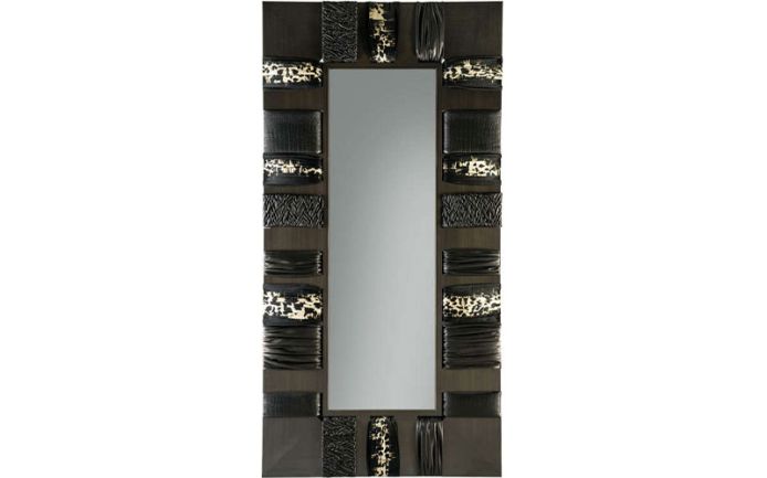 Frame in multilayer wood covered in leathers or fabrics from the collection. Brass metal panel in Brushed Dark Bronze finishing. Natural, bronzed or smoked mirror.