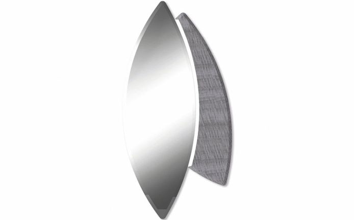 Oval floor mirror in combination of beveled glass and Madagascar figured Mowinghi veneer with high gloss polyester finish.