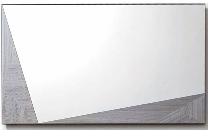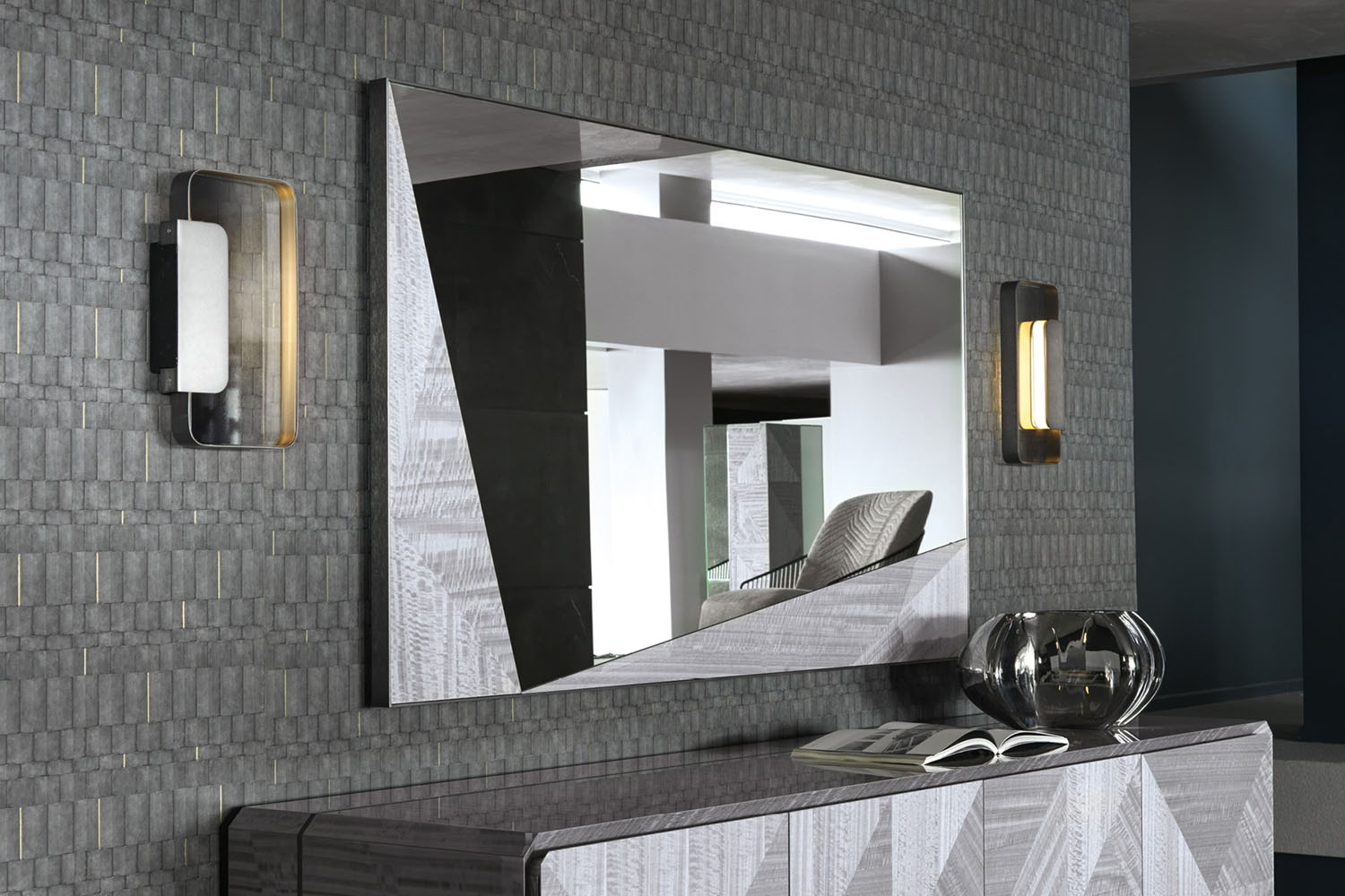 Rectangular mirror with inserts in inlaid Tasmanian curly Eucaliptus veneer with high gloss polyester finish. Frame in satin grey nickel stainless steel.