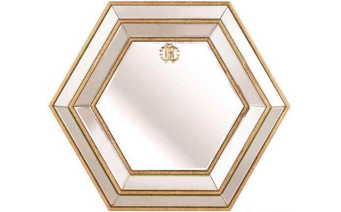 Structure in multilayer wood with bevelled natural mirrors. Hammered metal decoration with snake design in Gold finishing. RC “jewel monogram” in cast brass in platinum or gold finishing.