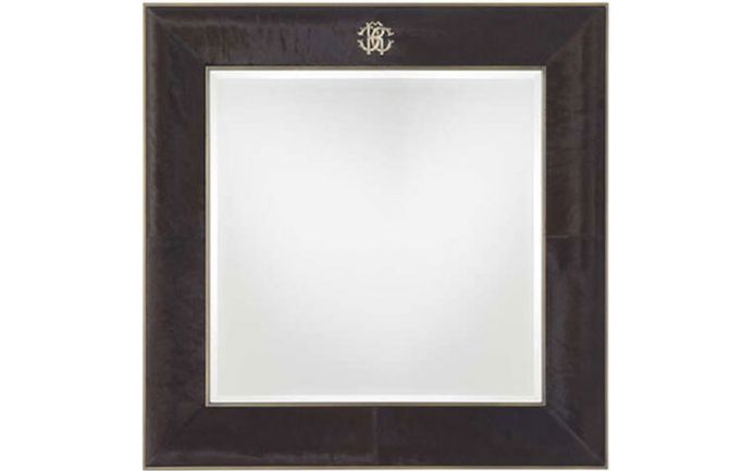 Wood frame covered in leather or eco-leather from the collection. Metal frame in the brushed finishings from the collection. Bevelled natural mirror. RC “jewel monogram” in cast brass in platinum or gold finishing.