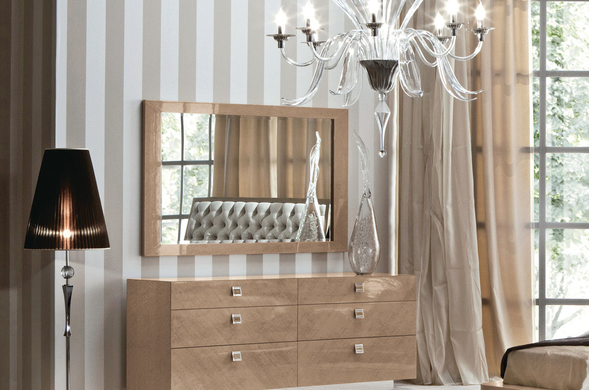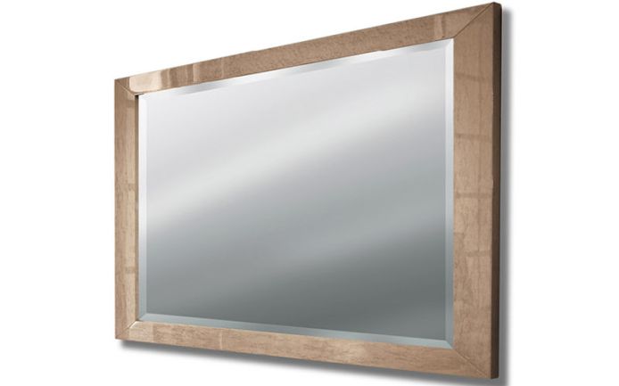 Beveled mirror finished in champagne bird’s eye maple veneer w/high gloss polyester.