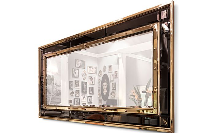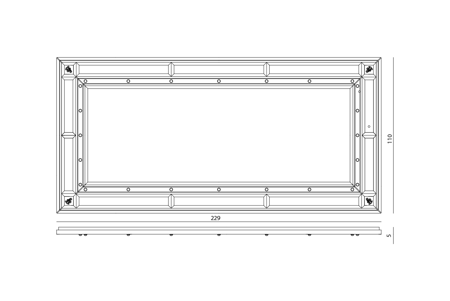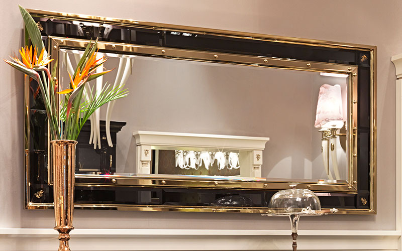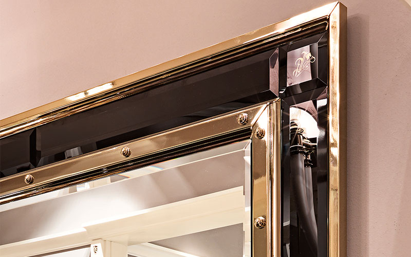 Frame composed of a band in black lacquered bevelled glass closed by a double chromed brass profile. Security mirror 5 mm th. The four glass brackets have sandblasted logo worked in gold leaf.